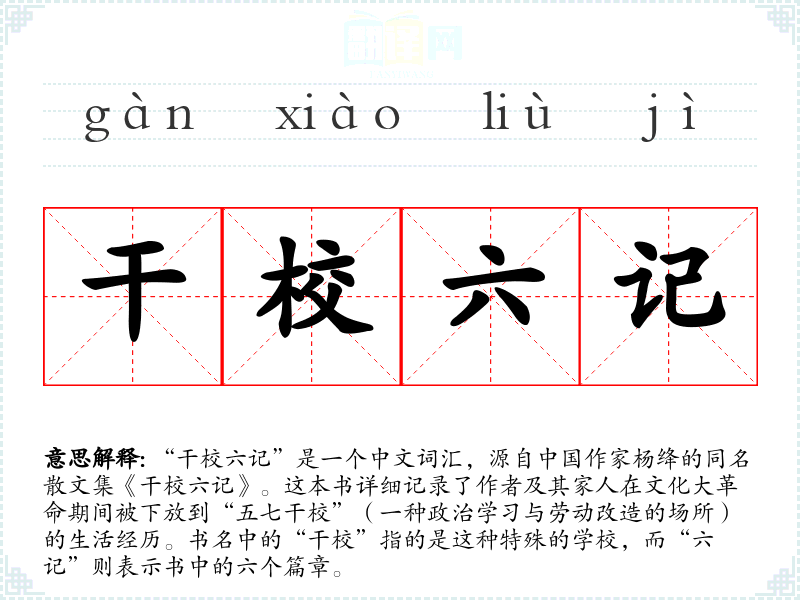 在文学语境中,“干校六记”通常指代杨绛的这部作品,用以讨论文化大革命期间的知识分子生活和心理状态。在口语中,这个词汇可能被用来泛指类似的经历或回忆。在专业领域,如历史学或社会学,它可能被用作研究文化大革命时期社会变迁的一个案例。