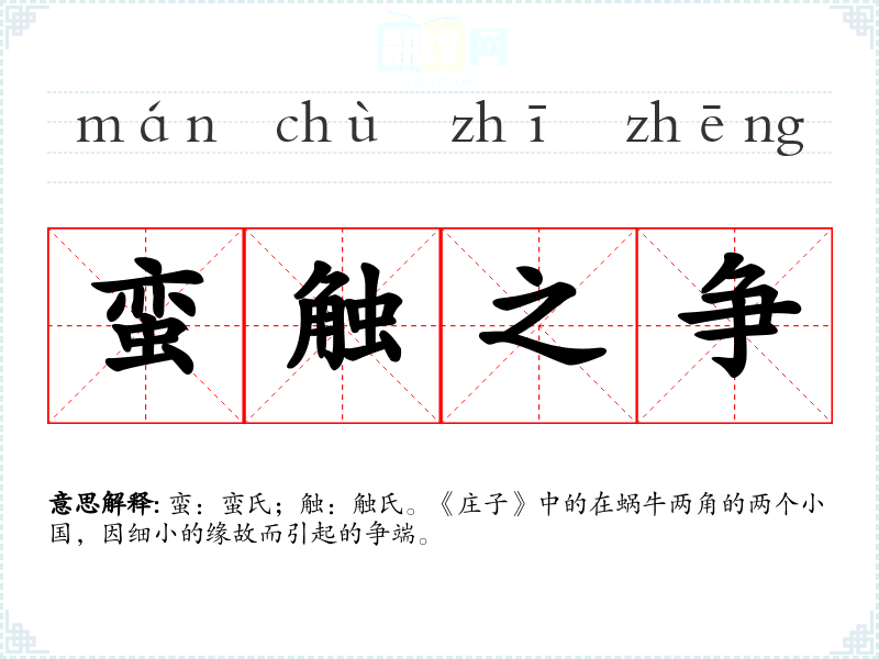 蛮:蛮氏;触:触氏。《庄子》中的在蜗牛两角的两个小国,因细小的缘故而引起的争端。