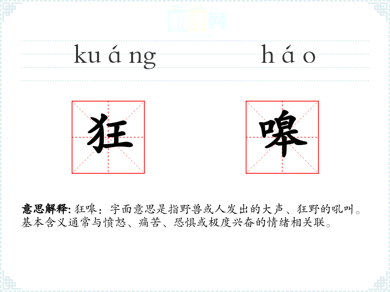 狂嗥:字面意思是指野兽或人发出的大声、狂野的吼叫。基本含义通常与愤怒、痛苦、恐惧或极度兴奋的情绪相关联。