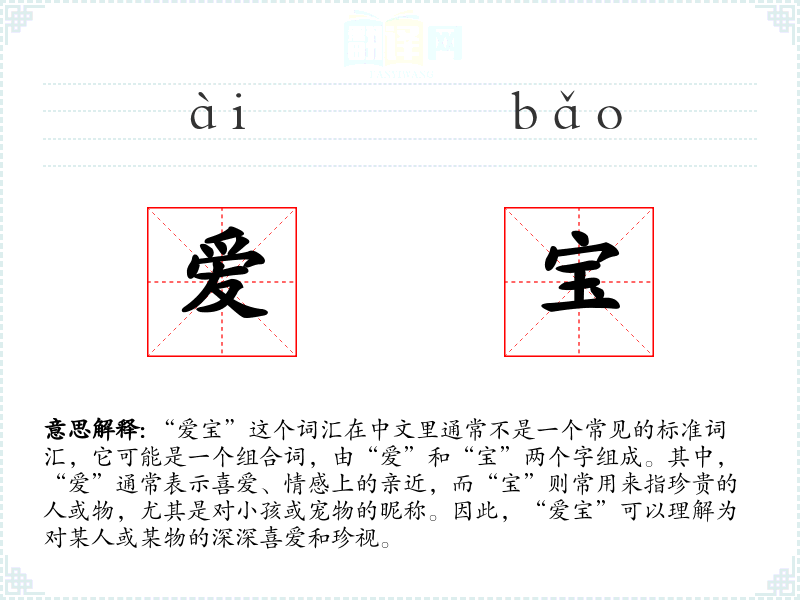 - 反义词:无(由于“爱宝”是一个表达正面情感的词汇,通常没有直接的反义词)
