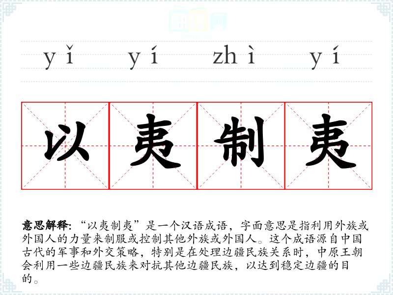 “以夷制夷”是一个汉语成语,字面意思是指利用外族或外国人的力量来制服或控制其他外族或外国人。这个成语源自**古代的军事和外交策略,特别是在处理边疆民族关系时,中原王朝会利用一些边疆民族来对抗其他边疆民族,以达到稳定边疆的目的。