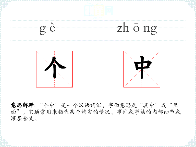 - 口语:在日常对话中,“个中”可以用来表达对某件事情的深入了解或内幕知识,如“你只知其一,不知个中奥妙”。