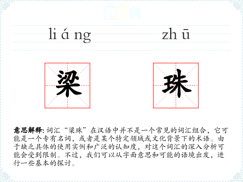 词汇“梁珠”在汉语中并不是一个常见的词汇组合,它可能是一个专有名词,或者是某个特定领域或文化背景下的术语。由于缺乏具体的使用实例和广泛的认知度,对这个词汇的深入分析可能会受到限制。不过,我们可以从字面意思和可能的语境出发,进行一些基本的探讨。