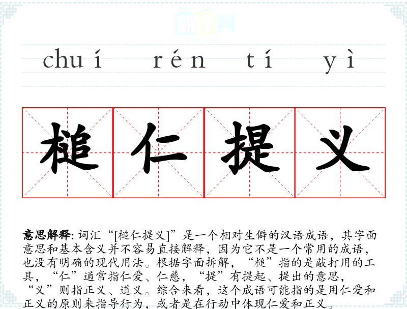 词汇“[槌仁提义]”是一个相对生僻的汉语成语,其字面意思和基本含义并不容易直接解释,因为它不是一个常用的成语,也没有明确的现代用法。根据字面拆解,“槌”指的是敲打用的工具,“仁”通常指仁爱、仁慈,“提”有提起、提出的意思,“义”则指正义、道义。综合来看,这个成语可能指的是用仁爱和正义的原则来指导行为,或者是在行动中体现仁爱和正义。