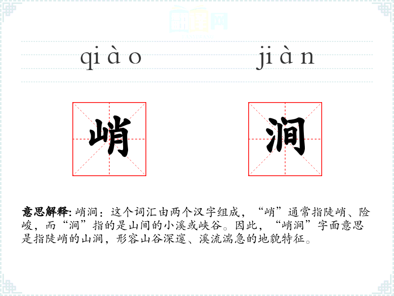 峭涧:这个词汇由两个汉字组成,“峭”通常指陡峭、险峻,而“涧”指的是山间的小溪或峡谷。因此,“峭涧”字面意思是指陡峭的山涧,形容山谷深邃、溪流湍急的地貌特征。