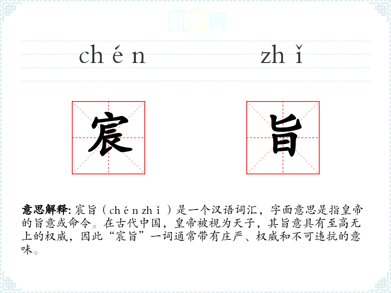 宸旨(chén zhǐ)是一个汉语词汇,字面意思是指的旨意或命令。在古代,**被视为天子,其旨意具有至高无上的权威,因此“宸旨”一词通常带有庄严、权威和不可违抗的意味。