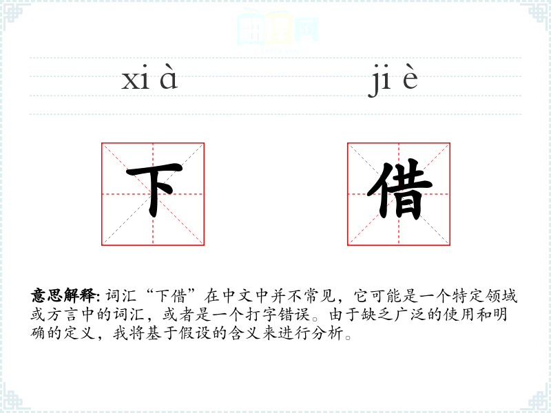 词汇“下借”在中文中并不常见,它可能是一个特定领域或方言中的词汇,或者是一个打字错误。由于缺乏广泛的使用和明确的定义,我将基于假设的含义来进行分析。