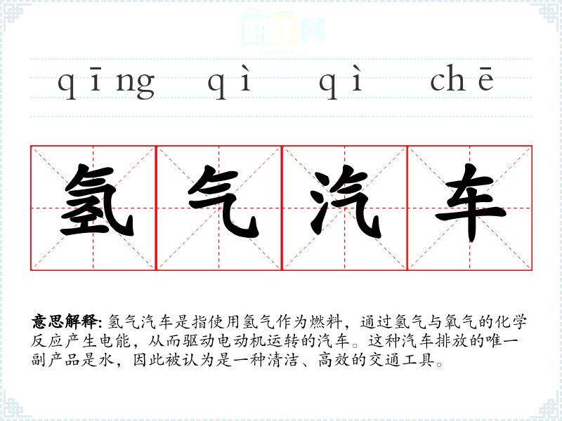 同义词:氢燃料汽车、氢能车 反义词:燃油汽车、电动汽车(仅指使用电池而非氢燃料电池的电动车)