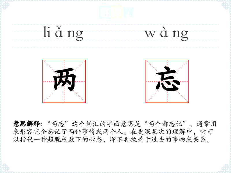 “两忘”这个词汇的字面意思是“两个都忘记”,通常用来形容完全忘记了两件事情或两个人。在更深层次的理解中,它可以指代一种超脱或放下的心态,即不再执着于过去的事物或关系。
