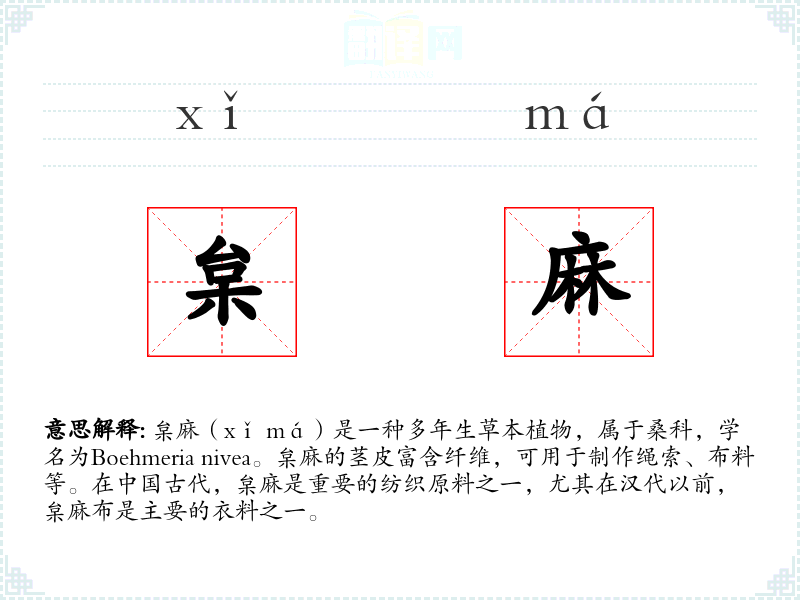- 反义词:丝绸(另一种纺织材料,与枲麻在质感和用途上有较大差异)
