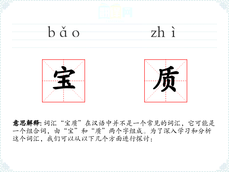 - 基本含义:结合来看,“宝质”可能指的是珍贵物质的性质或高质量的特性。