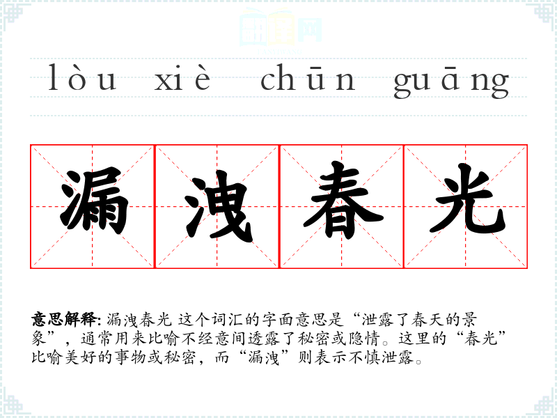 “漏洩春光”这个词汇源自**古代文学,特别是在诗词和小说中常见。随着时间的推移,这个词汇的含义和用法有所扩展,但核心意义保持不变,即指不经意间透露了原本应保密的信息或情感。