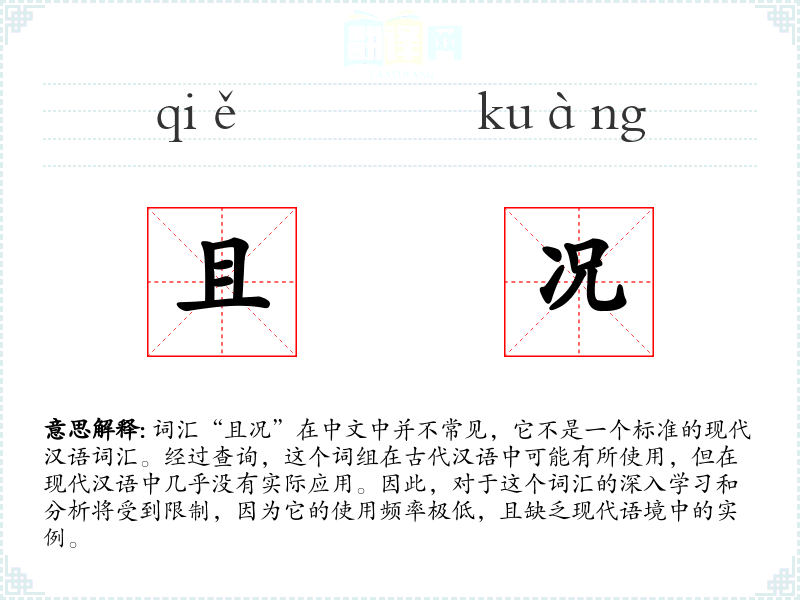 由于“且况”在现代汉语中不常用,我们无法提供一个确切的基本定义。在古代汉语中,它可能是一个连词,用于连接两个句子或短语,表示进一步的情况或理由。