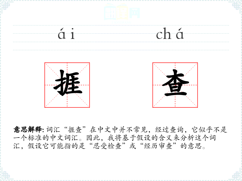 词汇“捱查”在中文中并不常见,经过查询,它似乎不是一个标准的中文词汇。因此,我将基于假设的含义来分析这个词汇,假设它可能指的是“忍受检查”或“经历审查”的意思。