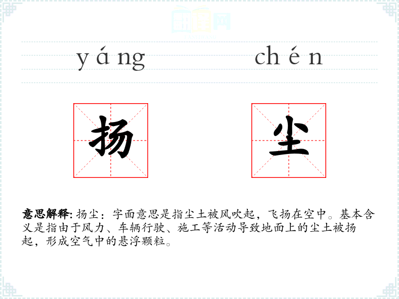 扬尘:字面意思是指尘土被风吹起,飞扬在空中。基本含义是指由于风力、车辆行驶、施工等活动导致地面上的尘土被扬起,形成空气中的悬浮颗粒。