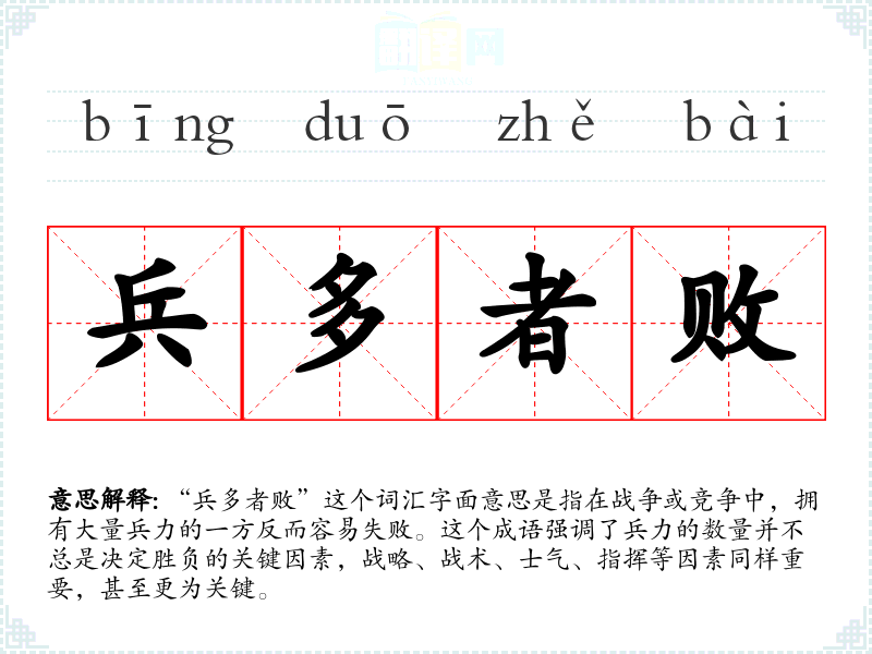 “兵多者败”这个词汇字面意思是指在战争或竞争中,拥有大量兵力的一方反而容易失败。这个成语强调了兵力的数量并不总是决定胜负的关键因素,战略、战术、士气、指挥等因素同样重要,甚至更为关键。