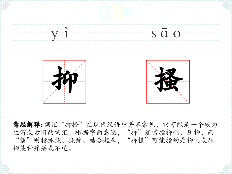 词汇“抑搔”在现代汉语中并不常见,它可能是一个较为生僻或古旧的词汇。根据字面意思,“抑”通常指抑制、压抑,而“搔”则指抓挠、挠痒。结合起来,“抑搔”可能指的是抑制或压抑某种痒感或不适。
