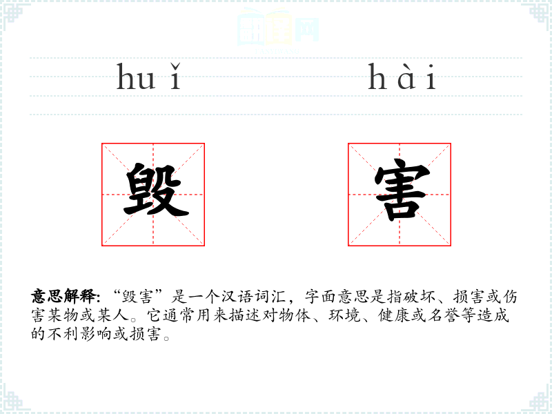 “毁害”由“毁”和“害”两个字组成,“毁”字古已有之,意为破坏、毁坏,“害”字则有伤害、损害之意。两个字组合起来,强化了破坏和损害的双重含义。