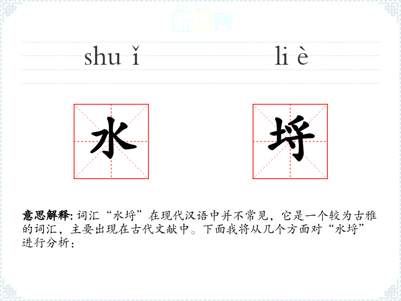 词汇“水埒”在现代汉语中并不常见,它是一个较为古雅的词汇,主要出现在古代文献中。下面我将从几个方面对“水埒”进行分析: