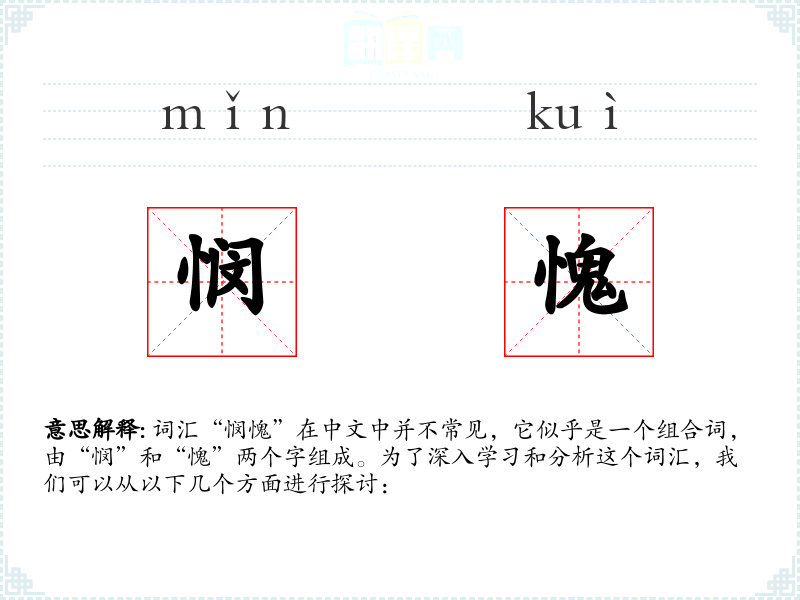 词汇“悯愧”在中文中并不常见,它似乎是一个组合词,由“悯”和“愧”两个字组成。为了深入学*和分析这个词汇,我们可以从以下几个方面进行探讨: