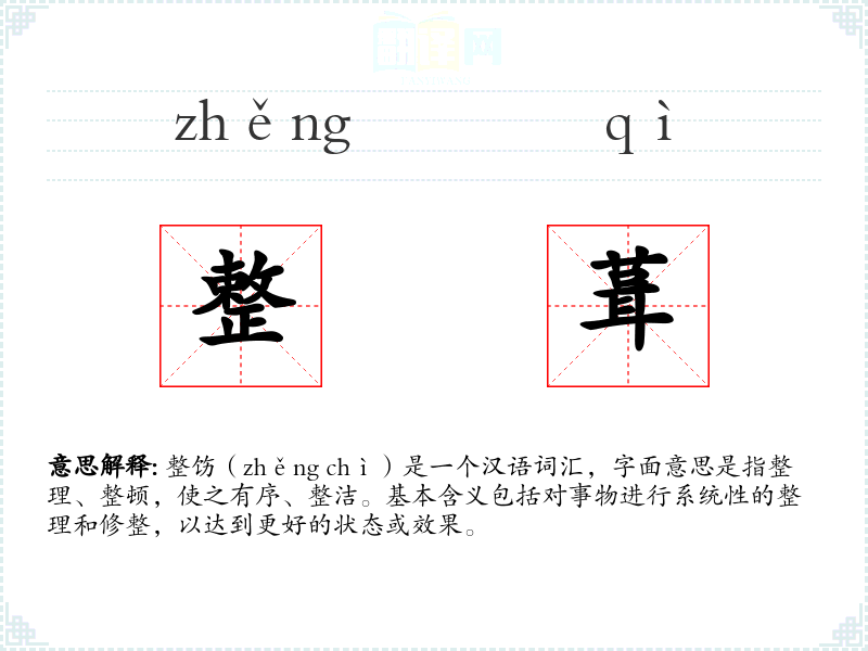 整饬(zhěng chì)是一个汉语词汇,字面意思是指整理、整顿,使之有序、整洁。基本含义包括对事物进行系统性的整理和修整,以达到更好的状态或效果。