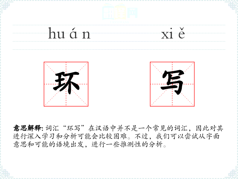 词汇“环写”在汉语中并不是一个常见的词汇,因此对其进行深入学习和分析可能会比较困难。不过,我们可以尝试从字面意思和可能的语境出发,进行一些推测性的分析。