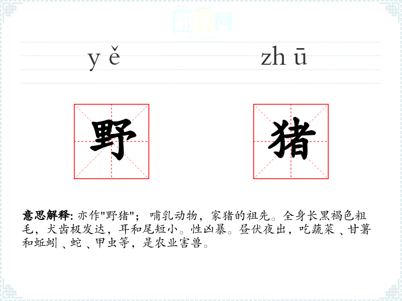 亦作"野猪"; 哺乳动物,家猪的祖先。全身长黑褐色粗毛,犬齿极发达,耳和尾短小。性凶暴。昼伏夜出,吃蔬菜﹑甘薯和蚯蚓﹑蛇﹑甲虫等,是农业害兽。