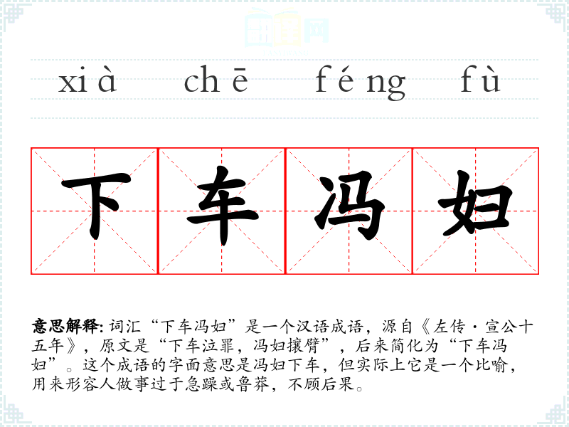 词汇“下车冯妇”是一个汉语成语,源自《左传·宣公十五年》,原文是“下车泣罪,冯妇攘臂”,后来简化为“下车冯妇”。这个成语的字面意思是冯妇下车,但实际上它是一个比喻,用来形容人做事过于急躁或鲁莽,不顾后果。