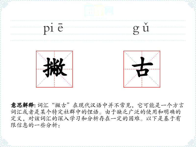 词汇“撇古”在现代汉语中并不常见,它可能是一个方言词汇或者是某个特定社群中的俚语。由于缺乏广泛的使用和明确的定义,对该词汇的深入学习和分析存在一定的困难。以下是基于有限信息的一些分析: