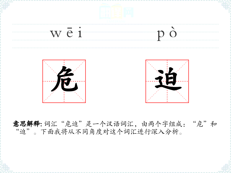 词汇“危迫”是一个汉语词汇,由两个字组成:“危”和“迫”。下面我将从不同角度对这个词汇进行深入分析。