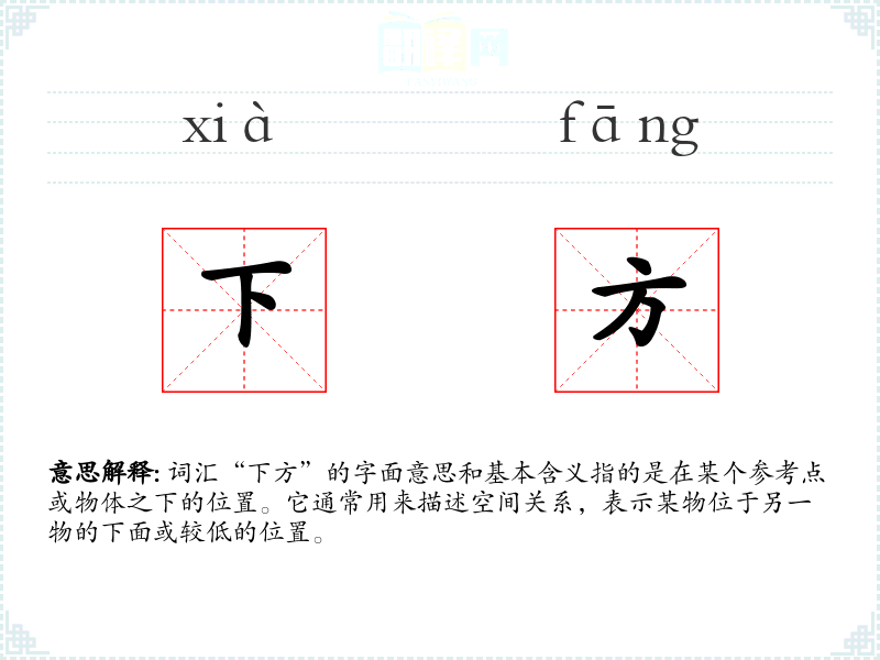 词汇“下方”的字面意思和基本含义指的是在某个参考点或物体之下的位置。它通常用来描述空间关系,表示某物位于另一物的下面或较低的位置。