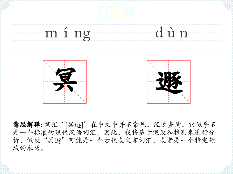 词汇“[冥遯]”在中文中并不常见,经过查询,它似乎不是一个标准的现代汉语词汇。因此,我将基于假设和推测来进行分析,假设“冥遯”可能是一个古代或文言词汇,或者是一个特定领域的术语。