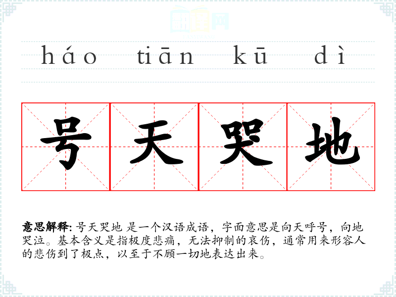 号天哭地 是一个汉语成语,字面意思是向天呼号,向地哭泣。基本含义是指极度悲痛,无法抑制的哀伤,通常用来形容人的悲伤到了极点,以至于不顾一切地表达出来。