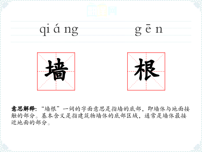 “墙根”一词的词源较为直接,由“墙”和“根”两个字组成,分别表示墙体和根部。在古代汉语中,“根”常用来指代事物的底部或基础部分,因此“墙根”自然就指墙体的底部。