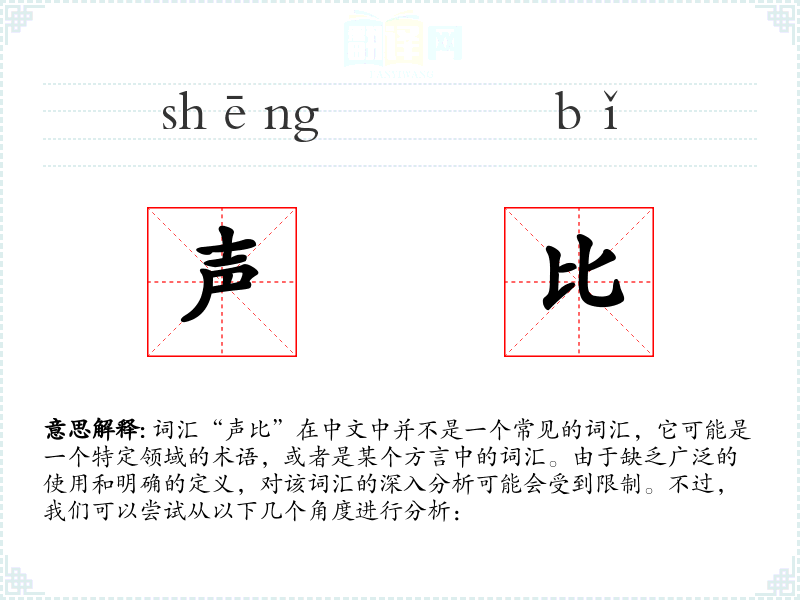 词汇“声比”在中文中并不是一个常见的词汇,它可能是一个特定领域的术语,或者是某个方言中的词汇。由于缺乏广泛的使用和明确的定义,对该词汇的深入分析可能会受到限制。不过,我们可以尝试从以下几个角度进行分析: