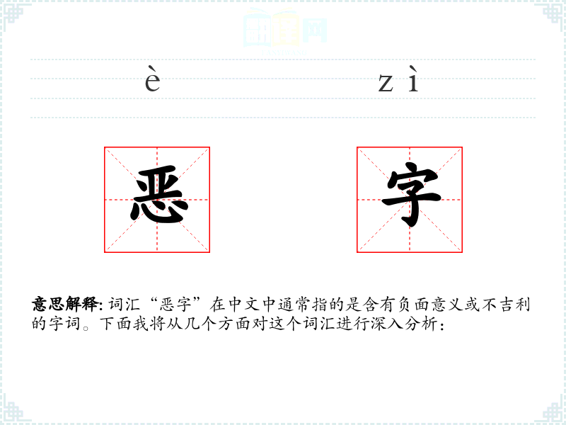 词汇“恶字”在中文中通常指的是含有负面意义或不吉利的字词。下面我将从几个方面对这个词汇进行深入分析: