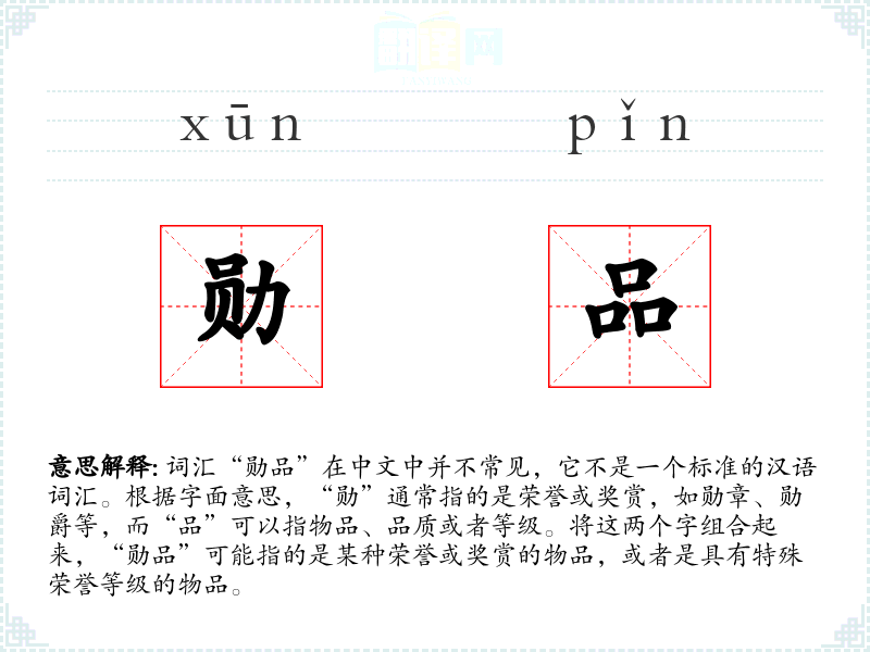 词汇“勋品”在中文中并不常见,它不是一个标准的汉语词汇。根据字面意思,“勋”通常指的是荣誉或奖赏,如勋章、勋爵等,而“品”可以指物品、品质或者等级。将这两个字组合起来,“勋品”可能指的是某种荣誉或奖赏的物品,或者是具有特殊荣誉等级的物品。