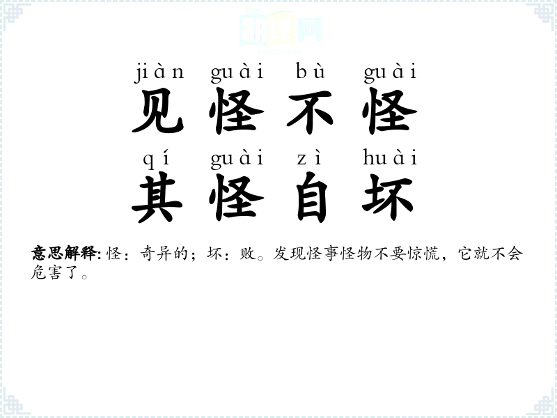 怪:奇异的;坏:败。发现怪事怪物不要惊慌,它就不会危害了。