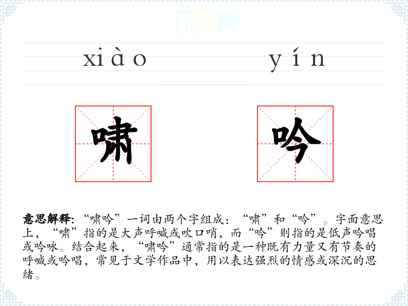 “啸吟”一词由两个字组成:“啸”和“吟”。字面意思上,“啸”指的是大声呼喊或吹口哨,而“吟”则指的是低声吟唱或吟咏。结合起来,“啸吟”通常指的是一种既有力量又有节奏的呼喊或吟唱,常见于文学作品中,用以表达强烈的情感或深沉的思绪。