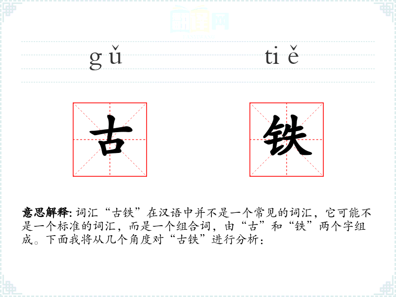 词汇“古铁”在汉语中并不是一个常见的词汇,它可能不是一个标准的词汇,而是一个组合词,由“古”和“铁”两个字组成。下面我将从几个角度对“古铁”进行分析: