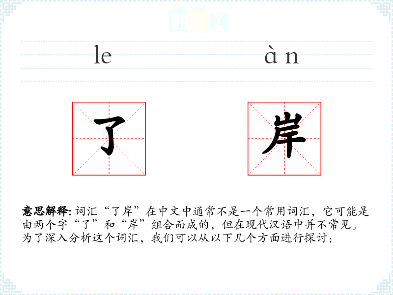 - 字面意思和基本含义:由于“了岸”不是一个标准词汇,我们可以将其拆分为“了”和“岸”来理解。