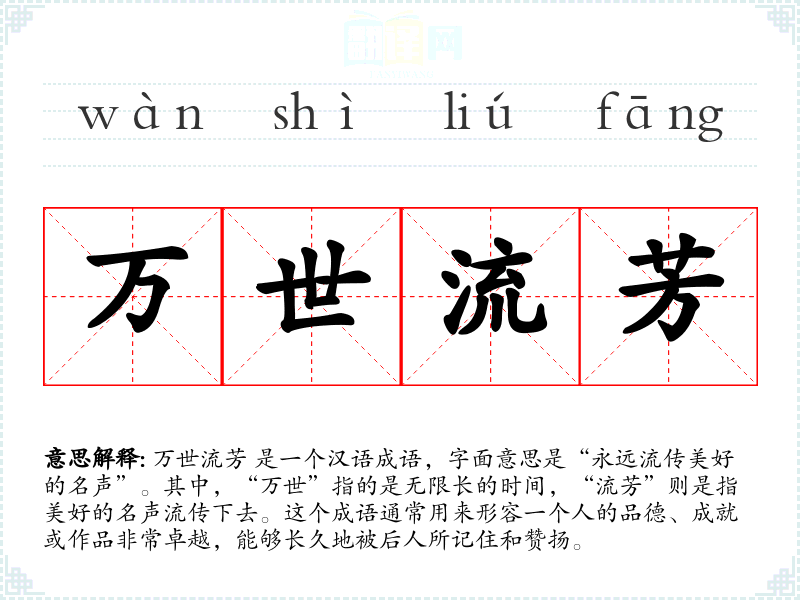 万世流芳 是一个汉语成语,字面意思是“永远流传美好的名声”。其中,“万世”指的是无限长的时间,“流芳”则是指美好的名声流传下去。这个成语通常用来形容一个人的品德、成就或作品非常卓越,能够长久地被后人所记住和赞扬。
