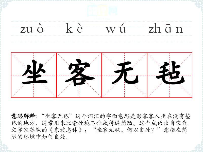 “坐客无毡”这个词汇的字面意思是形容客人坐在没有垫毡的地方,通常用来比喻处境不佳或待遇简陋。这个成语出自宋代文学家苏轼的《东坡志林》:“坐客无毡,何以自处?”意指在简陋的环境中如何自处。