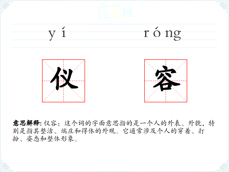 仪容:这个词的字面意思指的是一个人的外表、外貌,特别是指其整洁、端庄和得体的外观。它通常涉及个人的穿着、打扮、姿态和整体形象。