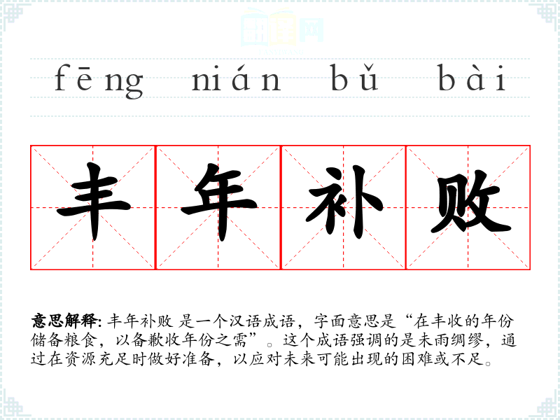丰年补败 是一个汉语成语,字面意思是“在丰收的年份储备粮食,以备歉收年份之需”。这个成语强调的是未雨绸缪,通过在资源充足时做好准备,以应对未来可能出现的困难或不足。