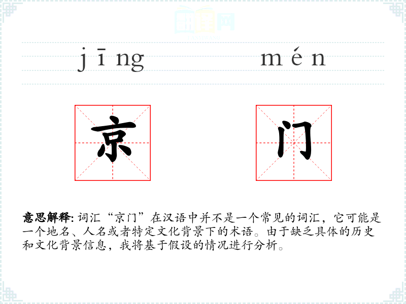 词汇“京门”在汉语中并不是一个常见的词汇,它可能是一个地名、人名或者特定文化背景下的术语。由于缺乏具体的历史和文化背景信息,我将基于假设的情况进行分析。