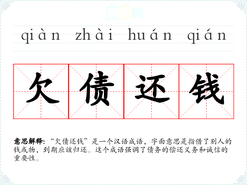 “欠债还钱”是一个汉语成语,字面意思是指借了别人的钱或物,到期应该归还。这个成语强调了债务的偿还义务和诚信的重要性。