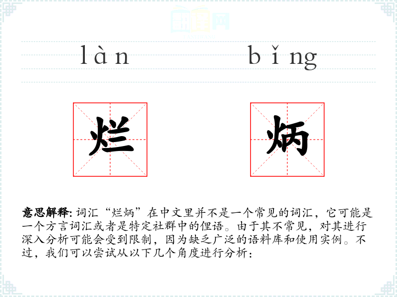 由于“烂炳”不是一个广泛使用的词汇,它在不同语境下的使用情况不详。如果它是一个方言词汇,那么它可能只在特定地区或社群中使用。