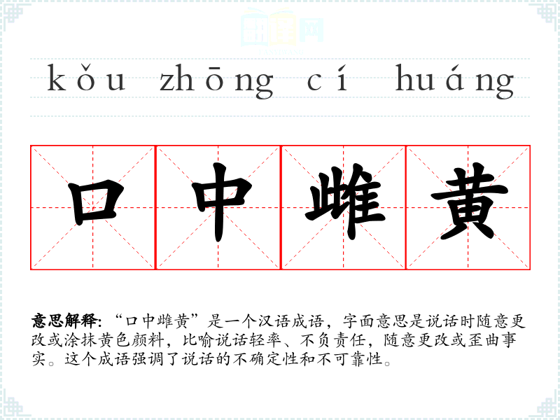 “口中雌黄”源自古代**,雌黄是一种黄色颜料,古人用它来修改书写错误。因此,“口中雌黄”比喻说话时随意更改,逐渐演变成形容人说话不可靠的成语。