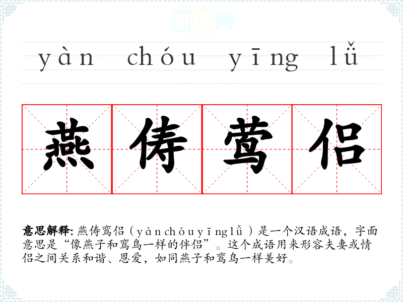 燕俦鸾侣(yàn chóu yīng lǚ)是一个汉语成语,字面意思是“像燕子和鸾鸟一样的伴侣”。这个成语用来形容夫妻或情侣之间关系和谐、恩爱,如同燕子和鸾鸟一样美好。